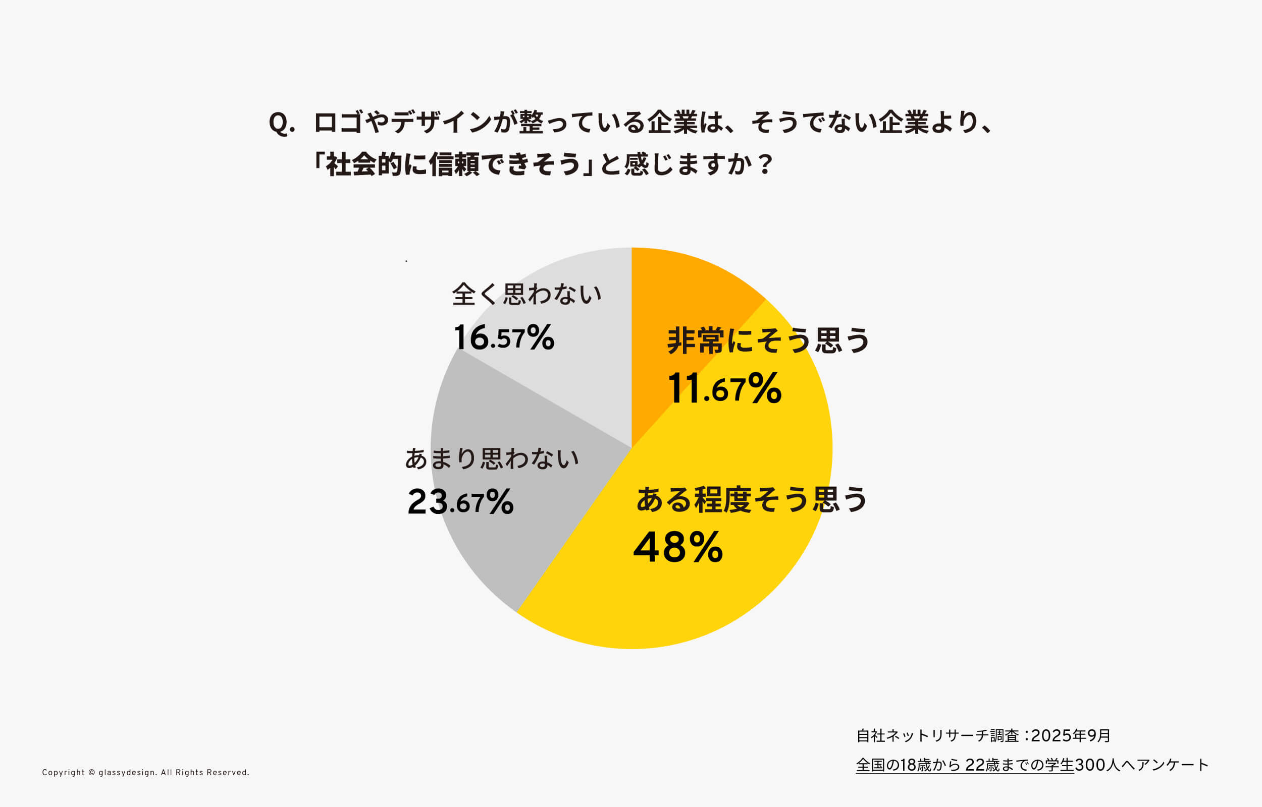 「ロゴやデザインが整っている企業は、そうでない企業より社会的に信頼できそうか?」という問いに、59.7%の学生が「そう思う」と回答しました。つまり半数以上の学生が、企業の信頼性をまずロゴから感じ取っているのです。
