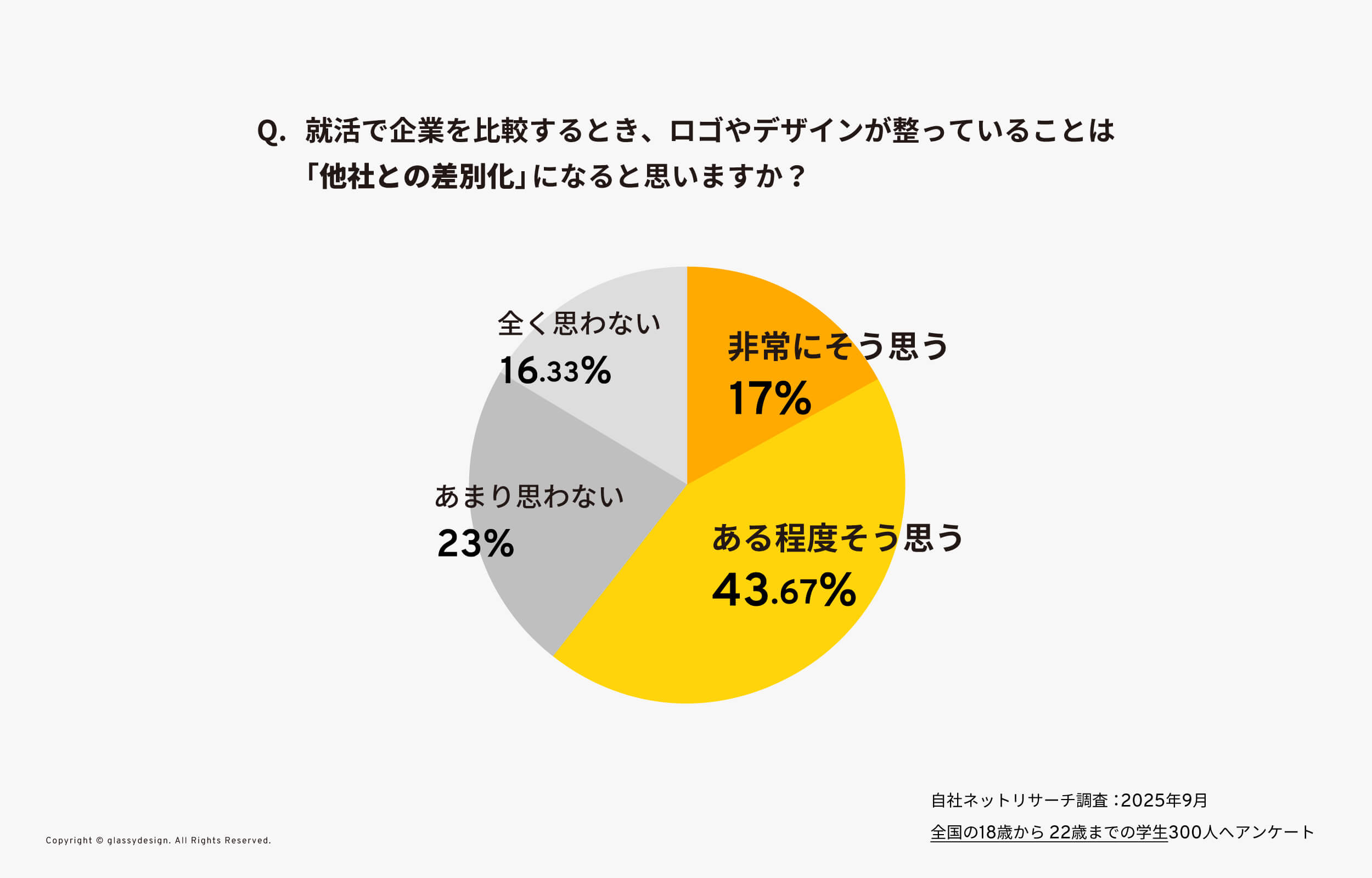 「就活で企業を比較するとき、ロゴやデザインが整っていることは差別化になるか?」という問いには、60.7%の学生が『なる』と回答。学生は情報が氾濫する中で企業を比較します。その際、ロゴは他社との違いを直感的に伝える手がかりになっていることがわかります。
