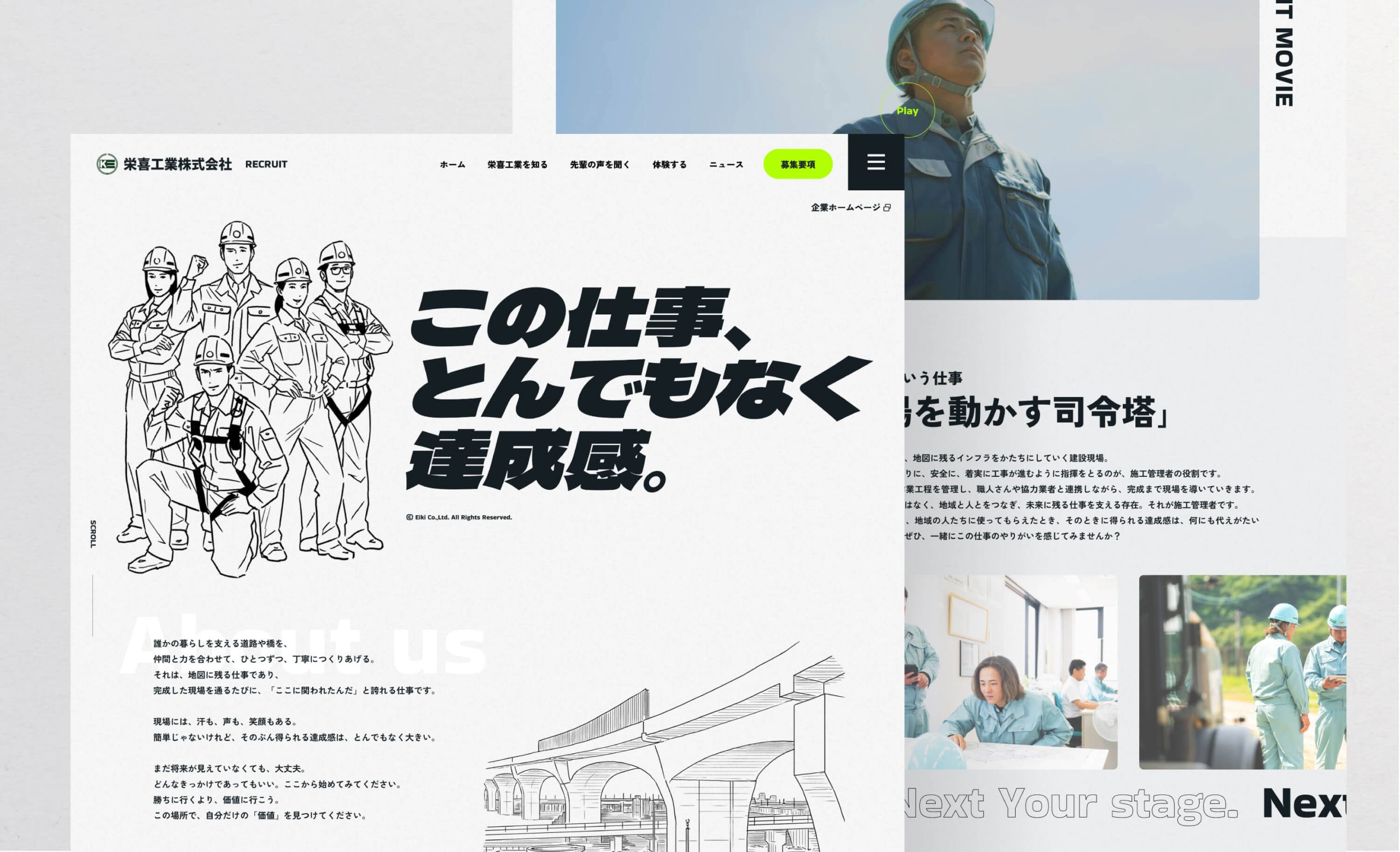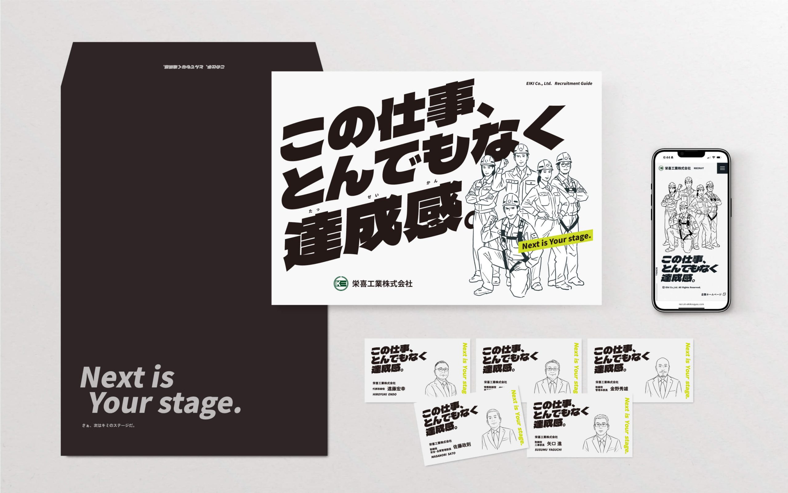 今回もっとも時間をかけたのは採用ブランディングの方向性と今後の展開で軸となるスローガン開発。丁寧にヒアリングを行い、ブランディングで何より重要な「企業文化」を明確にした上で、実際に働く人の声をもとにスローガン「この仕事、とんでもなく達成感。」を開発。そして動画、採用サイト、SNS、パンフレット、名刺、封筒、バナーデザインへ展開。ビジュアルの統一感はもちろん、これからの採用活動を支える強いブランド基盤が完成。求職者に「この会社で働きたい」と思ってもらえるブランド体験へとつなげています。