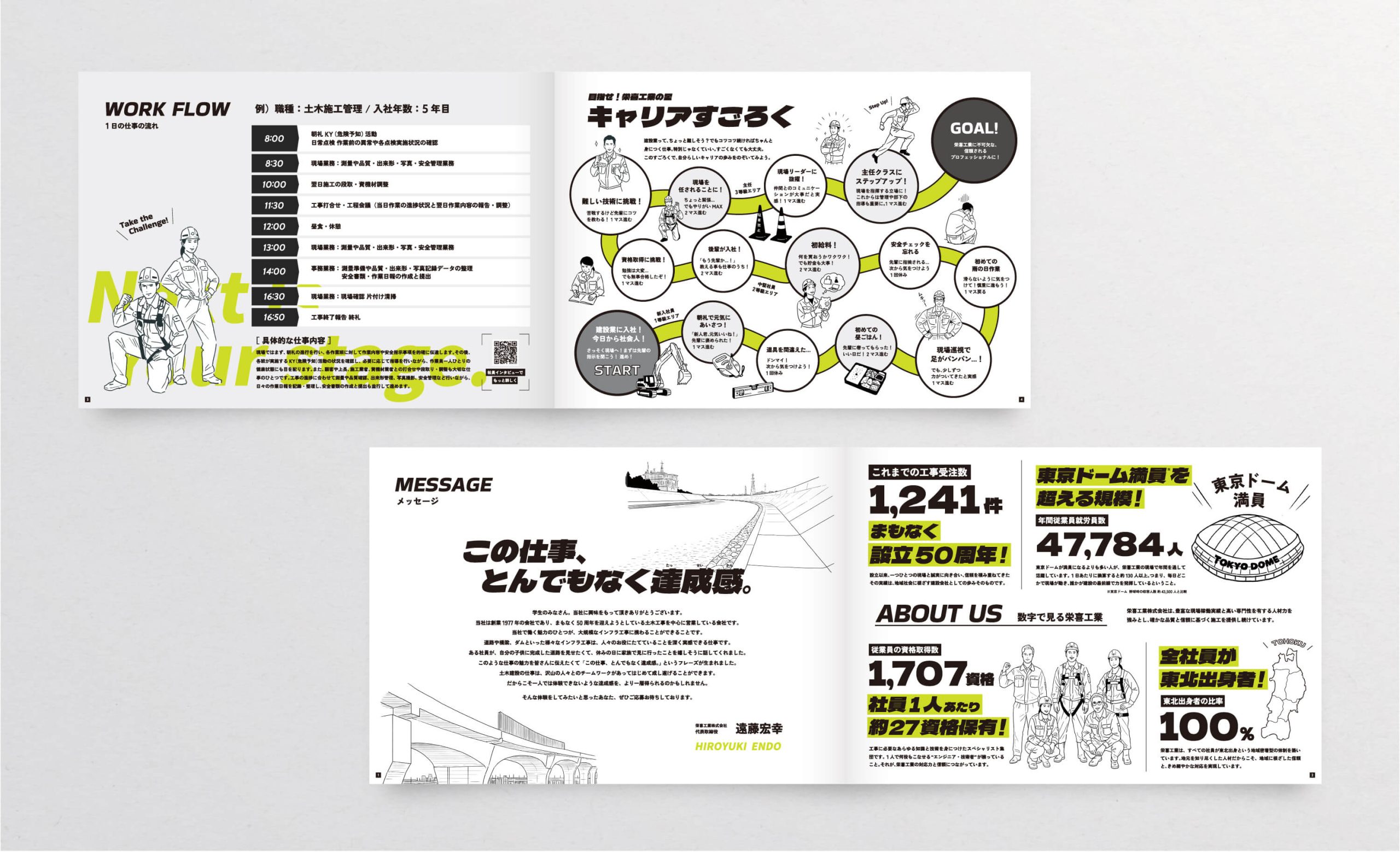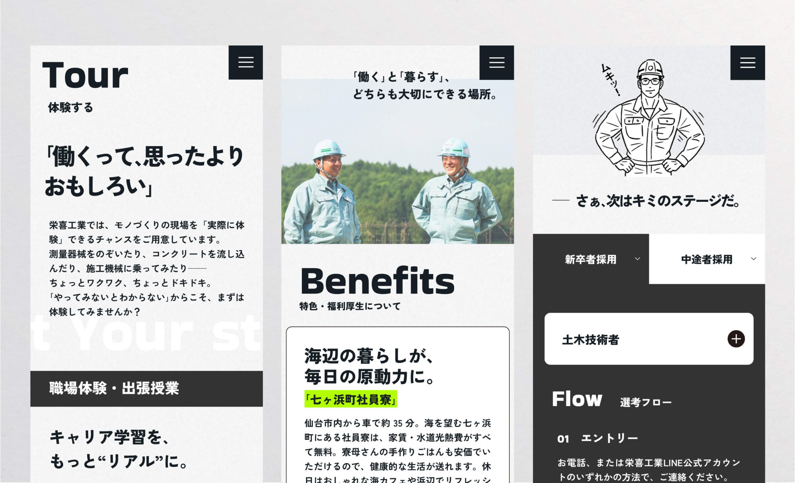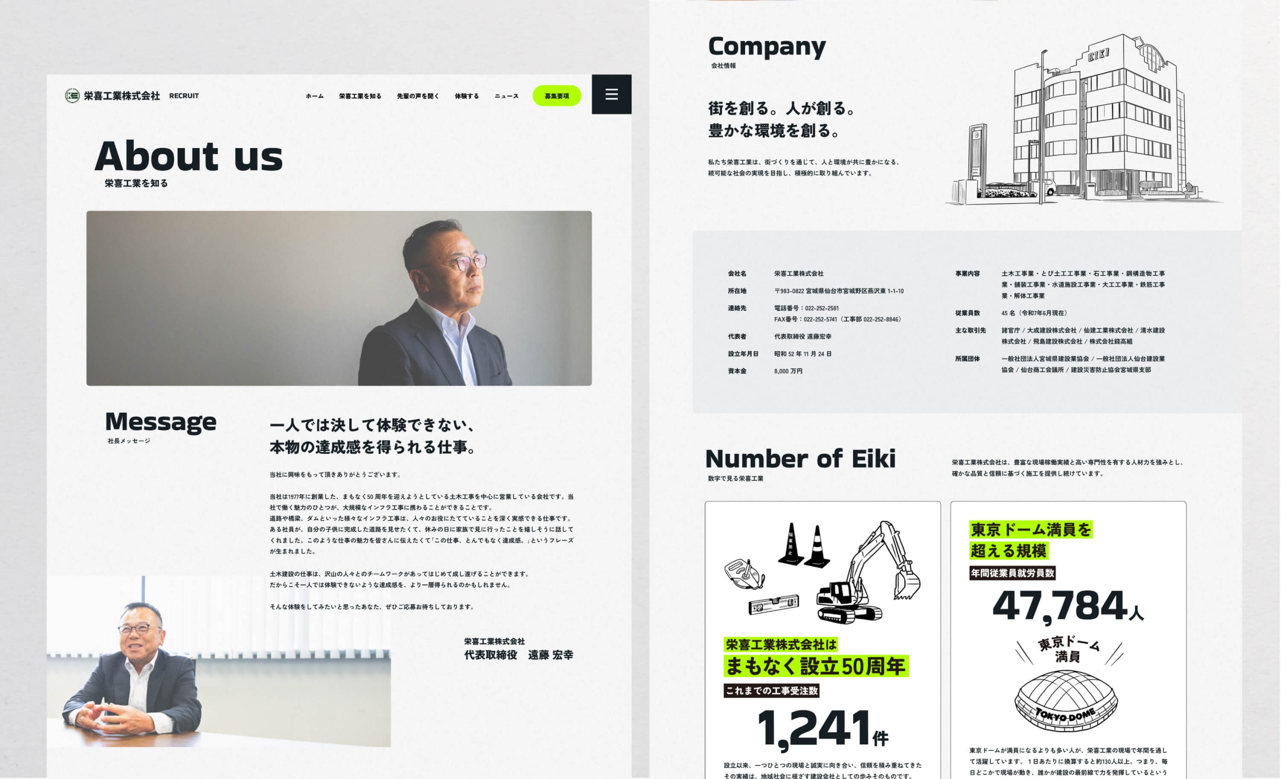 宮城県仙台市で主に土木工事を受注し、エリアは東北6県に及び現在着実に実績を伸ばしている栄喜工業株式会社様の採用ブランディングに関わらせていただきました。ブランディングの理解を深めていただくためのご提案からはじまり、企業文化を知るための社長をはじめとする役員の皆さんへの1on1ヒアリング、実際の現場へお邪魔しての現場見学と社員の方からのヒアリングなどなど、約1年をかけて採用ブランディングの具体化・整備を行いました。